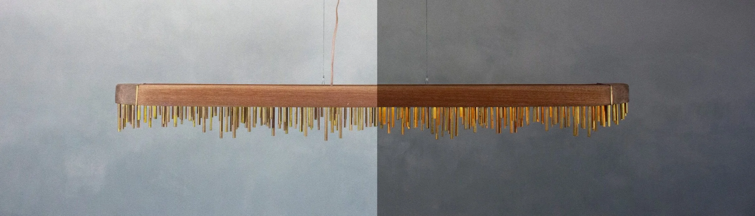 This tabletop lamp is made from merbau hardwood and adorned with approximately 200 hand-cut brass pipes. Beyond its appealing aesthetics and practical functionality, this handmade piece carries a personal design narrative.